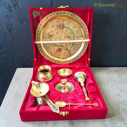 Premium Brass Pooja Thali Set with Meenakari Work, Aarti Thali, with Red Velvet Box | 8 in