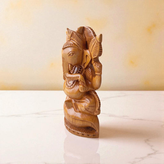 SacredFig Vighnaharta Ganesh Idol | 8 in | Ganesh Idol With Ornamental Shade | Wooden Idol for Spiritual & Home Decor