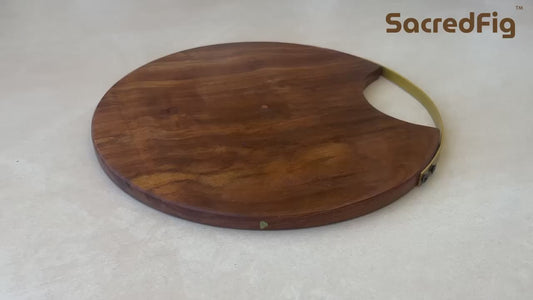 SacredFig Premium Cutting Board & Serving Platter, Made in Sheesham Wood, Golden Handle - 12 in (d)