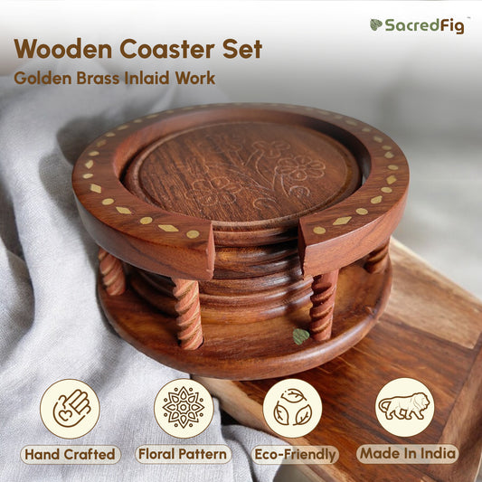 Wooden Coaster Set with Brass Inlay on Top | Classical Ring Shape Floral Pattern | 5×5 in