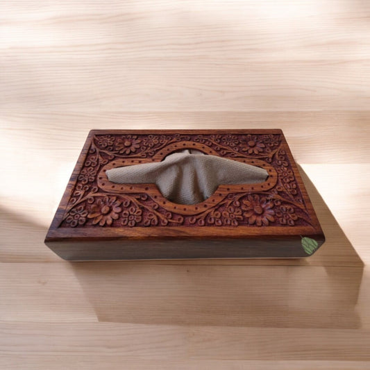 SacredFig Premium Wooden Tissue Holder Box | Elegant Floral Carving Design | 9×5 in