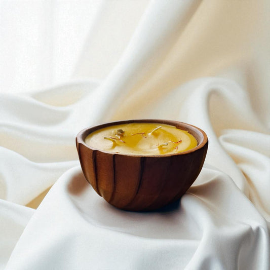 Premium Kesar Soy & Coconut Wax Scented Candle, Striped Wooden Bowl by SacredFig - 5x5x2.75 in