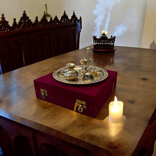 Brass Pooja Thali with 5 essential accessories with Red Velvet Box | 8 in