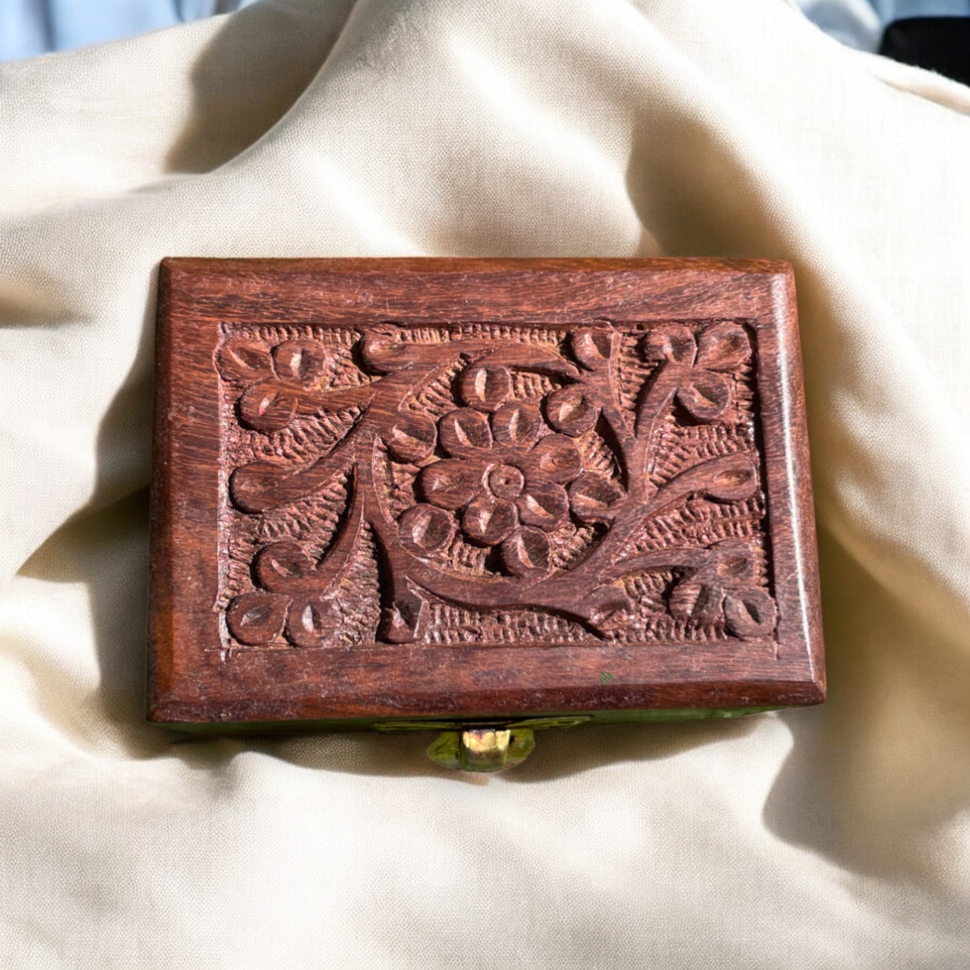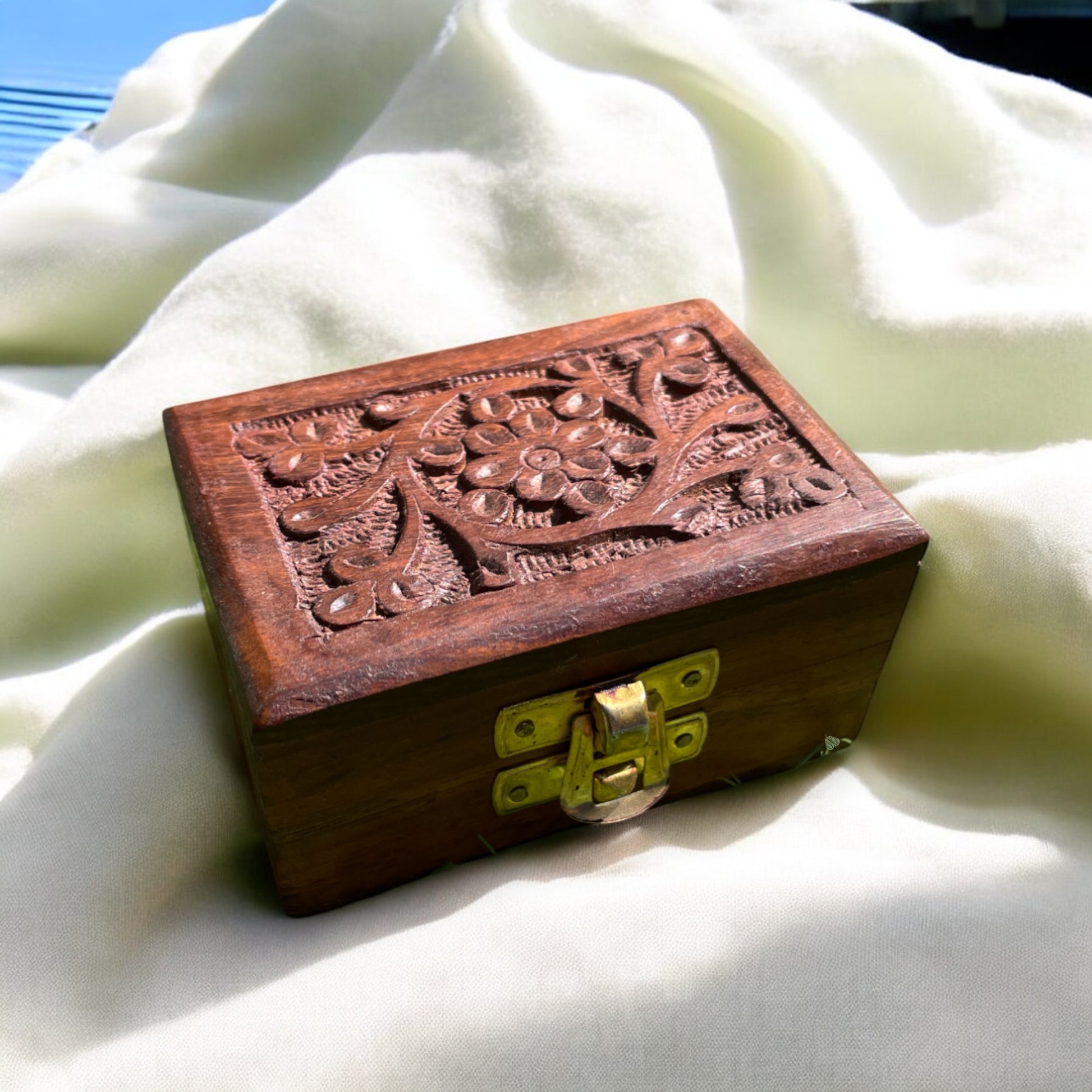 Handcarved Wooden Jewelry Box with Floral Carving & Brass Latch | Small Storage Organizer | 3×2 in |