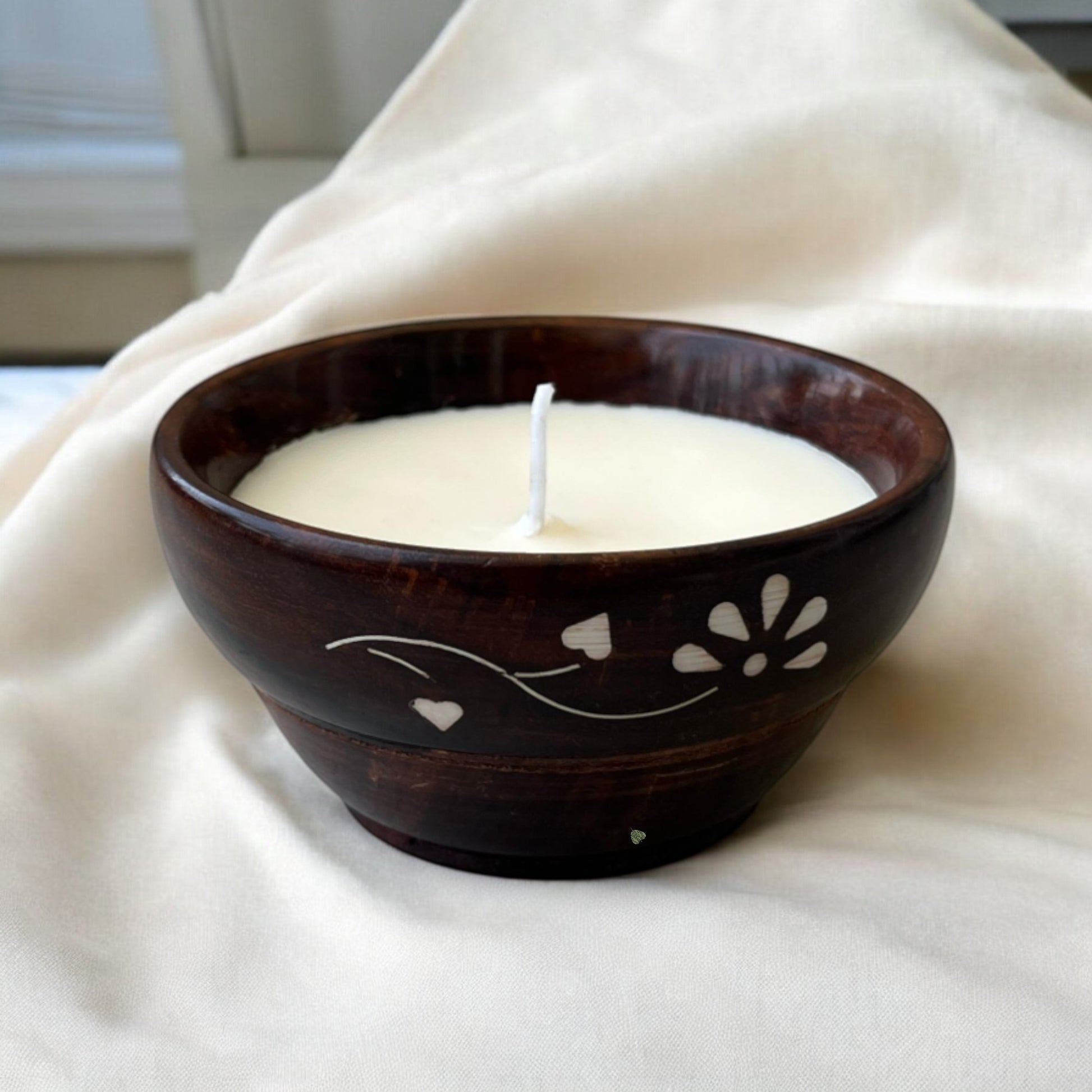 Experience the luxurious scent of our handcrafted wooden scented candle, featuring a beautiful floral inlay design. Made with premium wax, this artisanal home fragrance will elevate any room. With its elegant wooden bowl and unique floral pattern, it also makes for a perfect, one-of-a-kind gift.