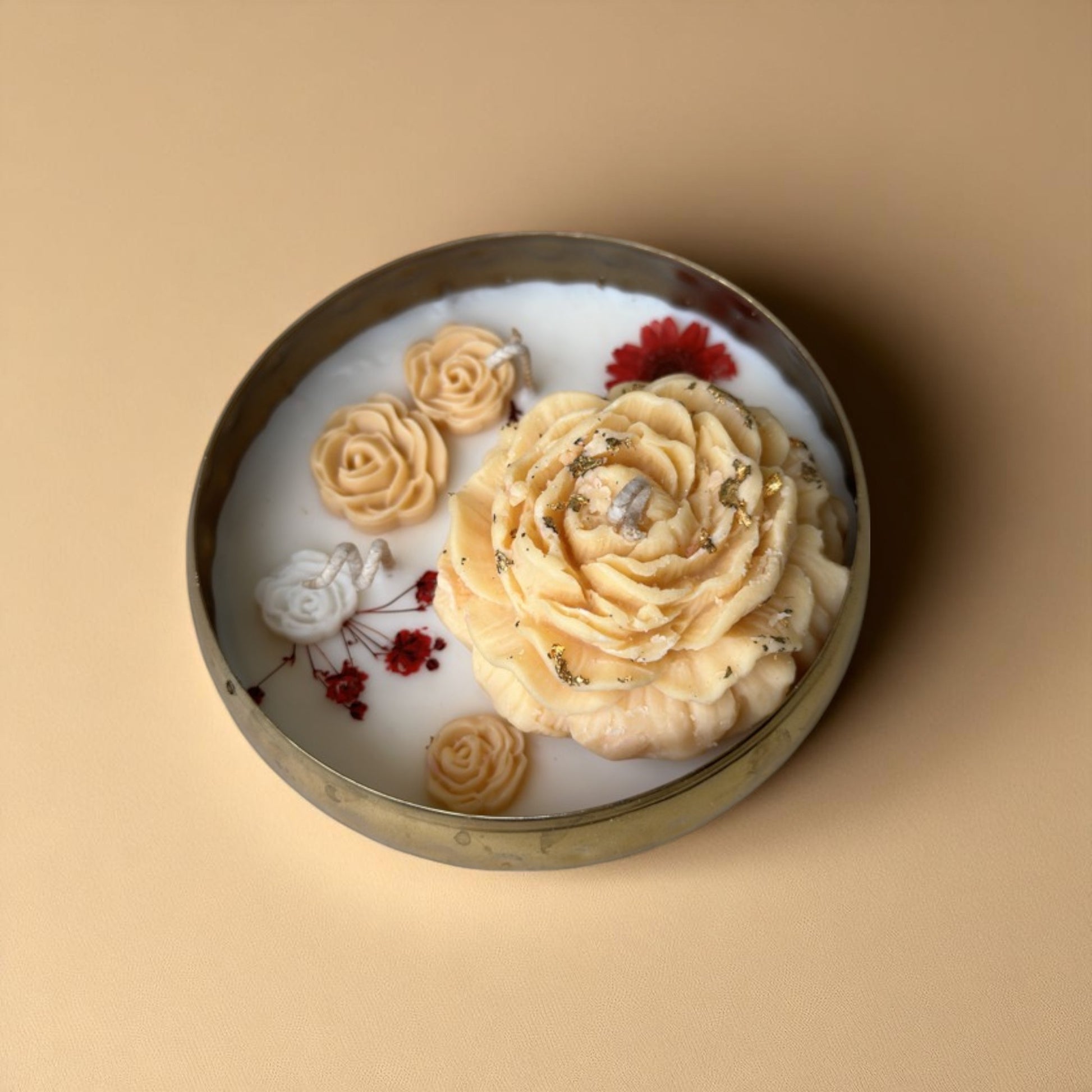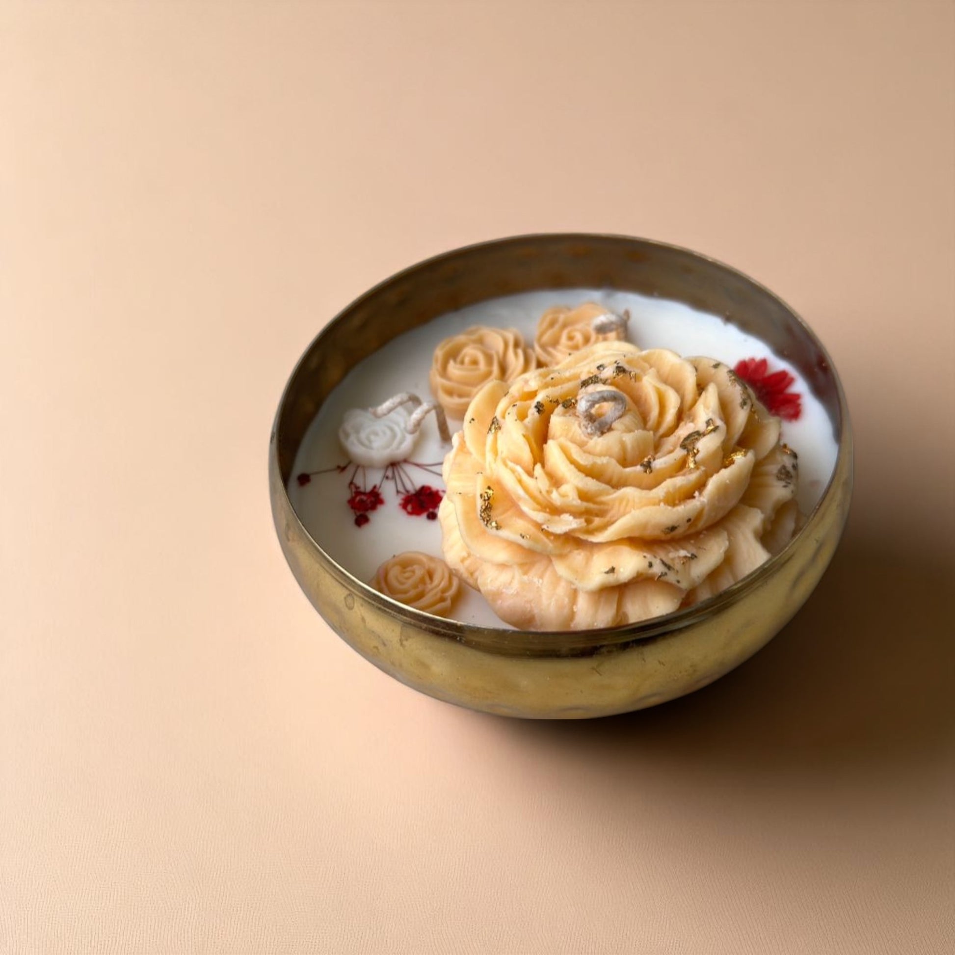 Elevate your ambiance with this handcrafted scented candle set in a 12 cm diameter, 4 cm high round metal urli. Expertly designed, it combines traditional aesthetics with contemporary style, offering a soothing fragrance that enhances relaxation and warmth. Perfect for enriching your living space, festive settings, or as a refined gift, this candle adds a subtle yet sophisticated touch of heritage and elegance to any room.