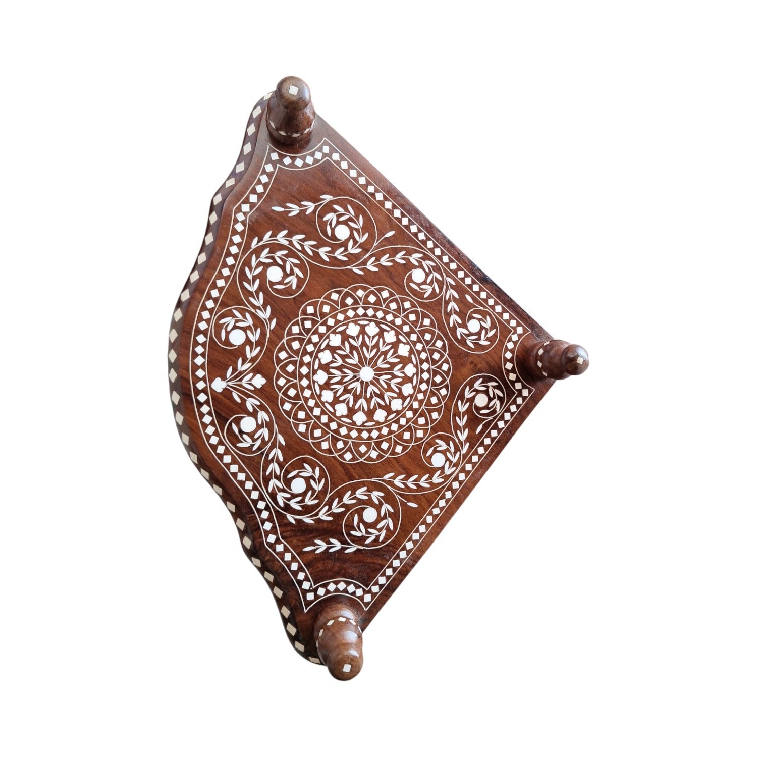 This premium wooden side stand features three spacious tiers, expertly crafted to provide both functionality and elegance. The intricate white inlay floral work adds a refined decorative touch, making it ideal for showcasing decor or organizing essentials. Its sturdy construction ensures durability, while the artistic design enhances any living space with a sophisticated charm. Perfect for those seeking a blend of traditional craftsmanship and practical storage.