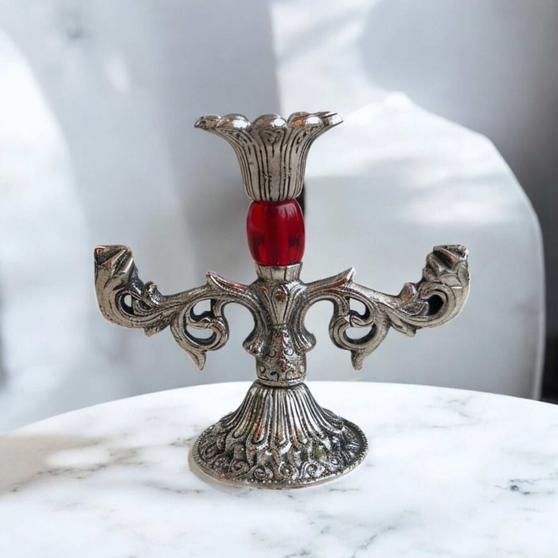 Enhance your home decor with the Regal Silver Candle Holder. This handcrafted silver candle holder features stunning red detailing that adds a touch of elegance to any room. Its antique-style design and ornate craftsmanship make it a one-of-a-kind statement piece. Perfect for adding a sophisticated touch to your table or as a festive centerpiece.