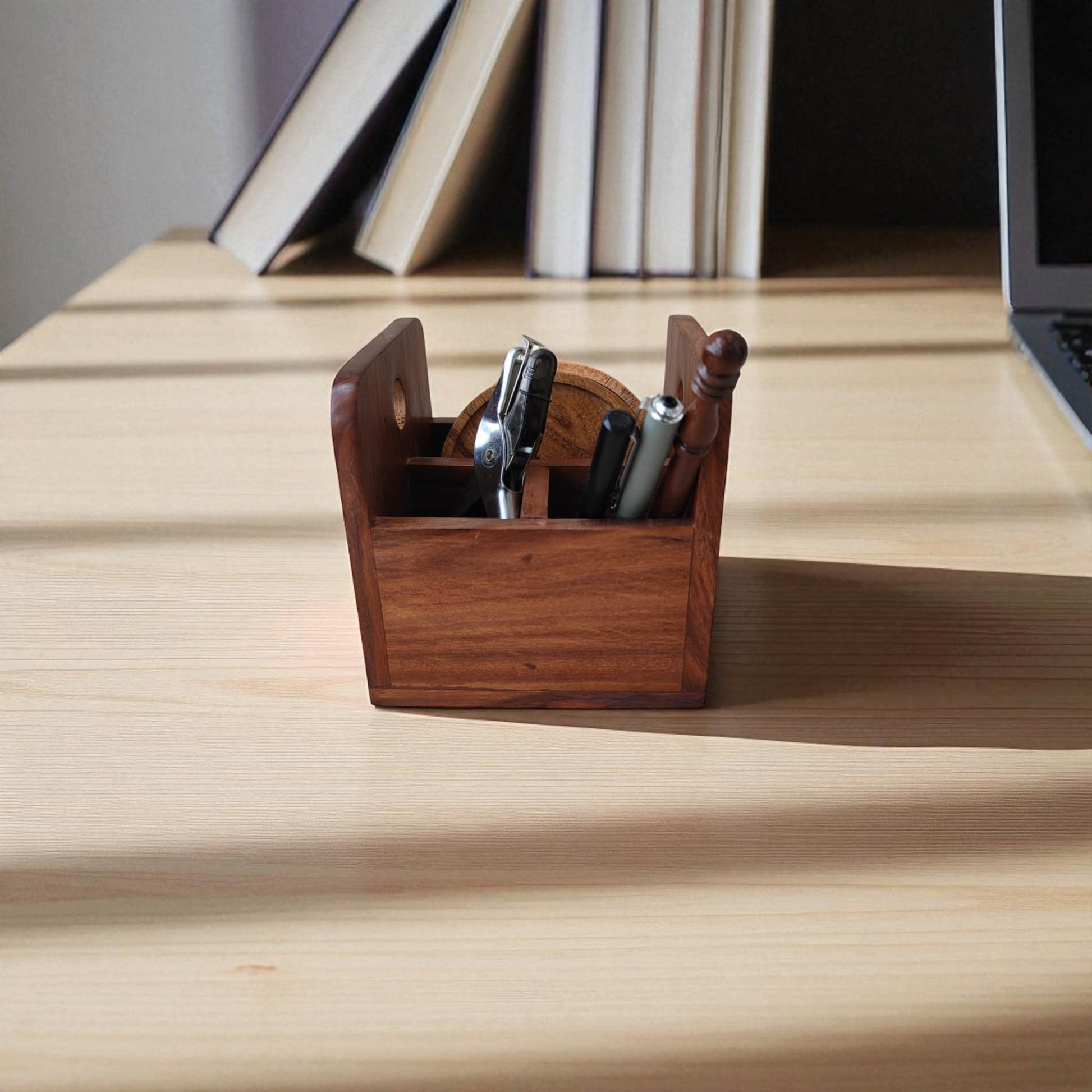 SacredFig Desk Organiser in Sheesham Wood | Premium 3 Compartment Compact Pen & Stationery Holder