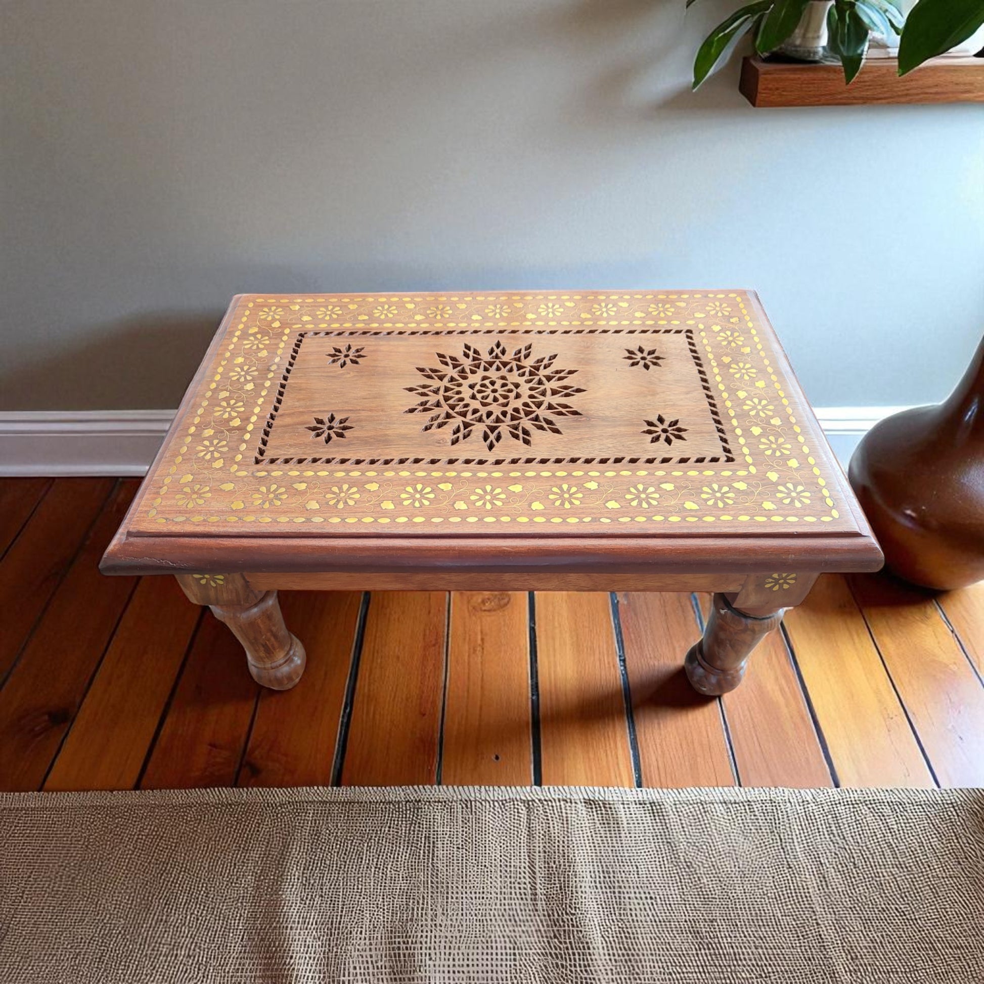 SacredFig Handcrafted Chowki | Pooja Chowki in Sheesham Wood | Intricate Brass Inlay Work (18x12 in)