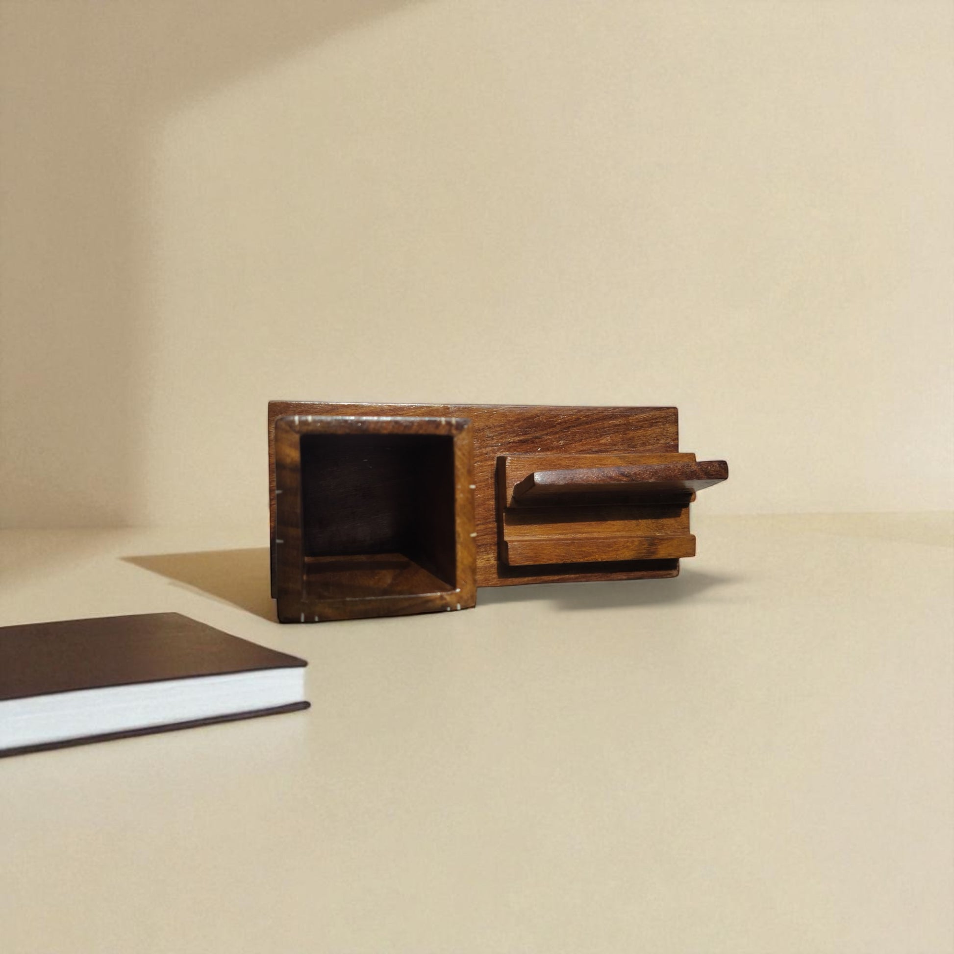 This SacredFig Pen and Mobile Holder serves as a versatile and stylish desk organizer, with two compartments. The intricate inlaid work adds beauty and its functionality is a plus point to add in your workspace. Keep your essentials organized and easily accessible with this dark wood polished pen holder.