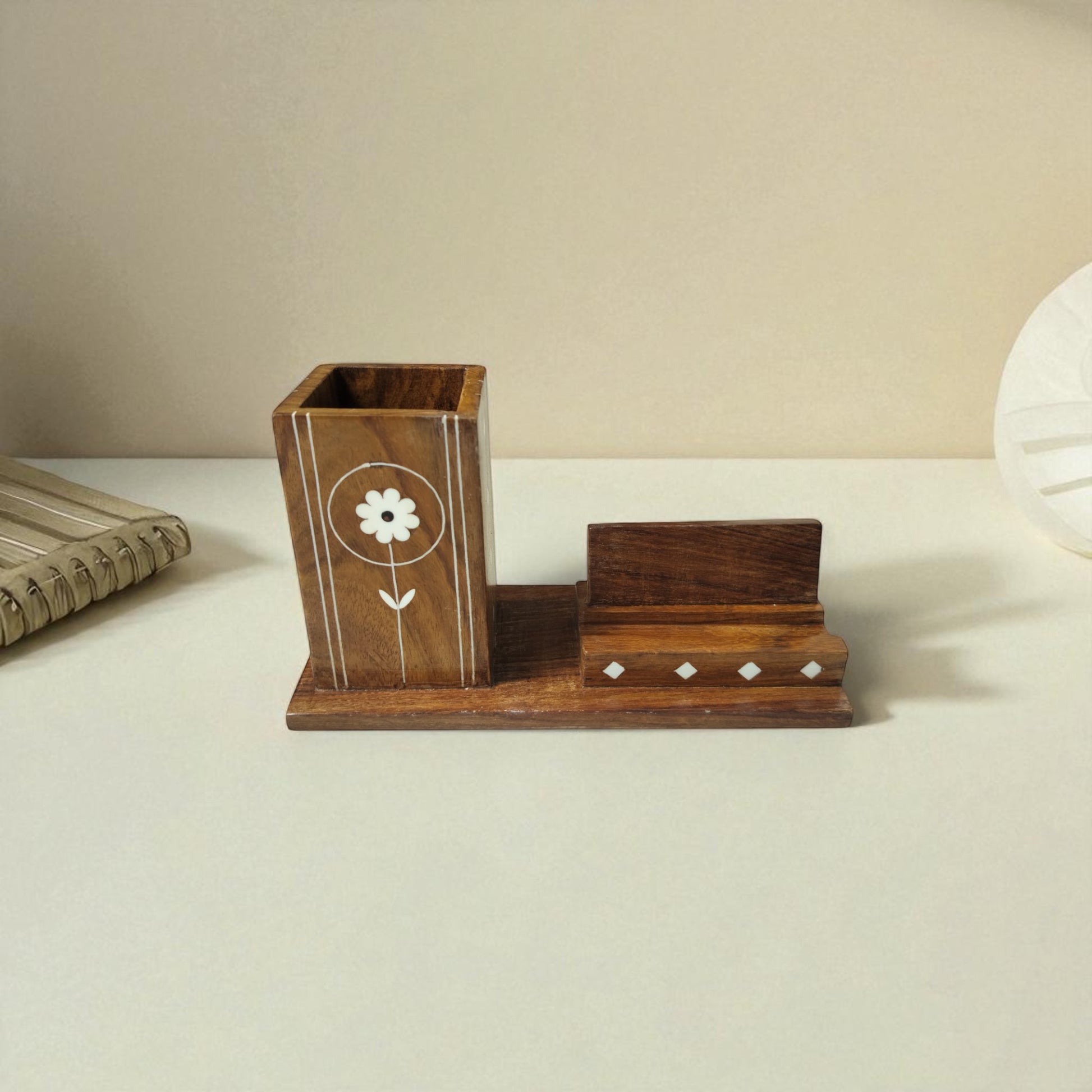 SacredFig Pen and Mobile Holder| Organizer for Desk| Inlaid Detailed Work | 7 × 3 in