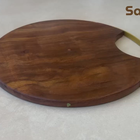SacredFig Premium Cutting Board & Serving Platter, Made in Sheesham Wood, Golden Handle - 12 in (d)