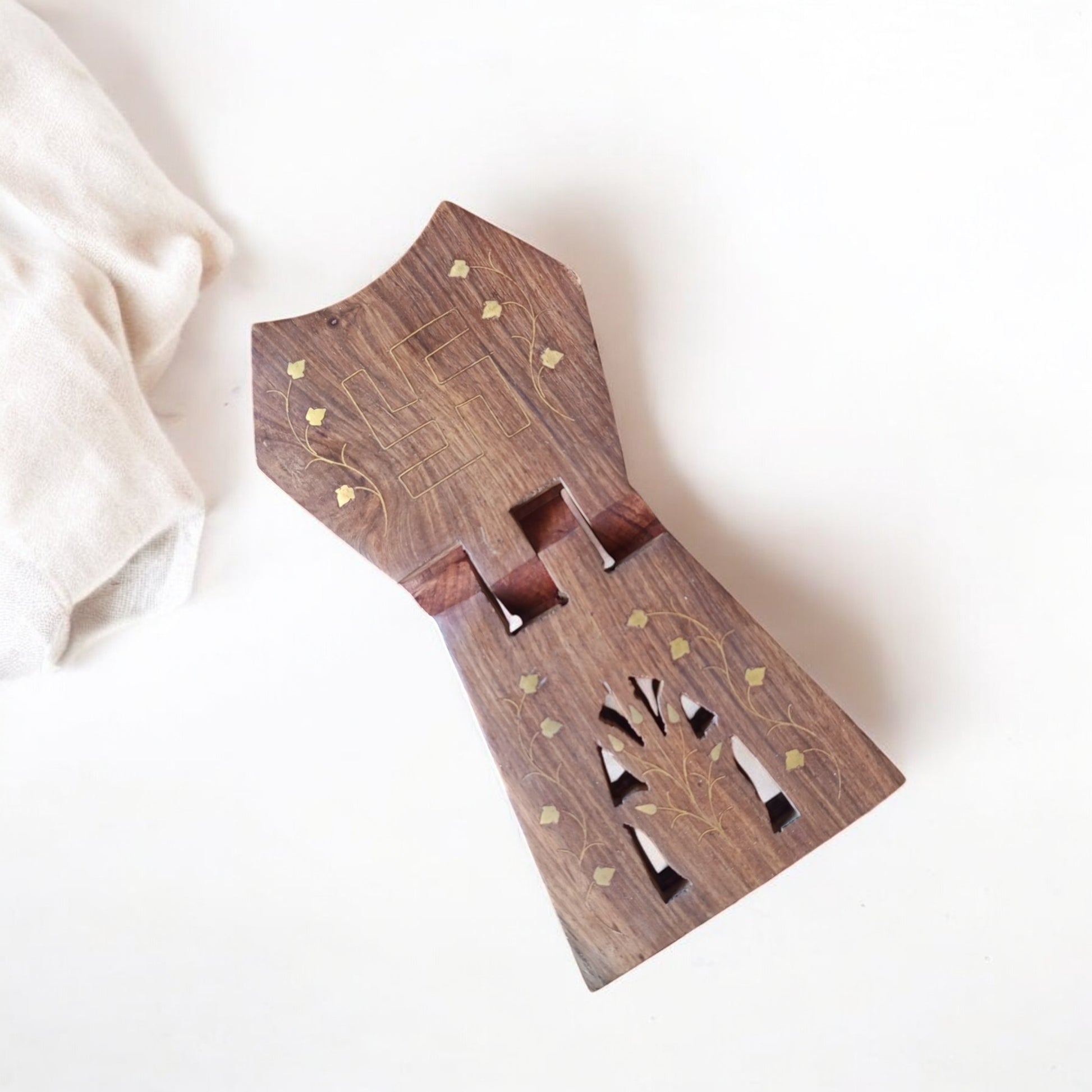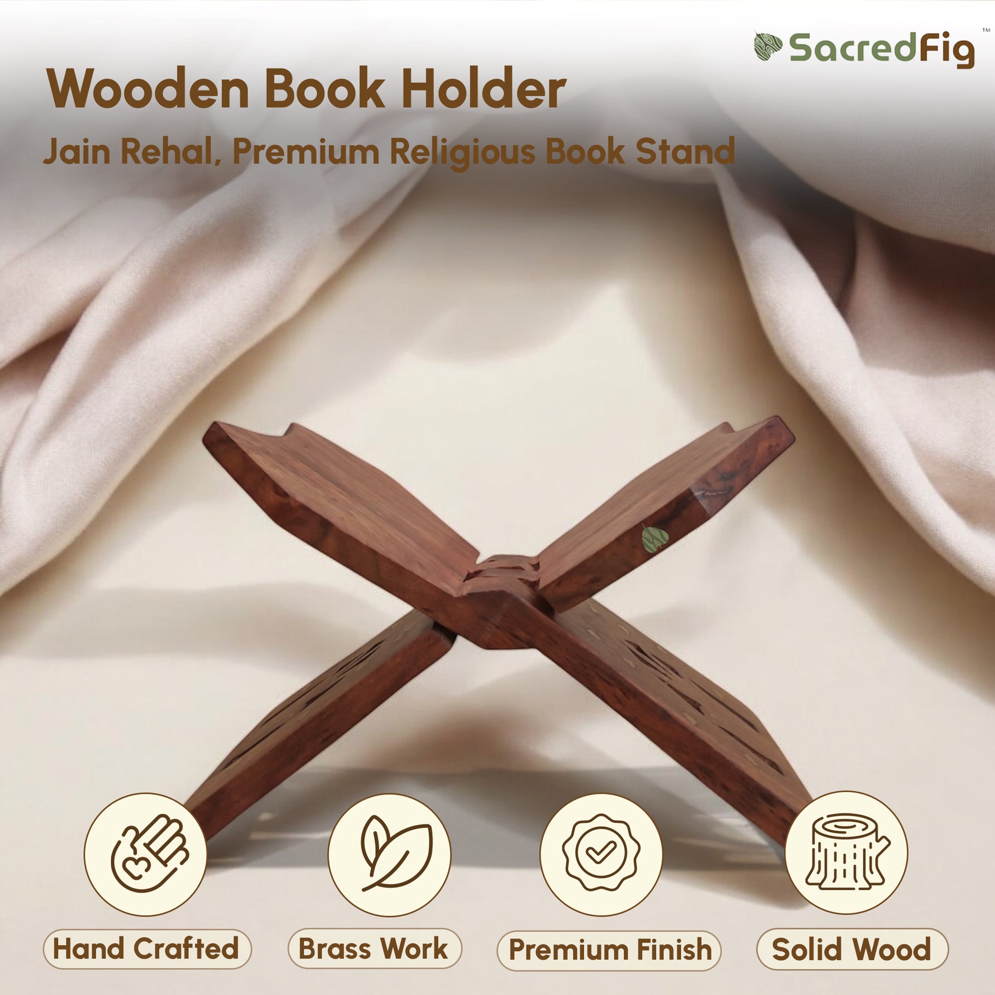 SacredFig Sheesham Wood Book Holder with brass work| Jain Rehal, Jain Religious Book Stand| 9 × 4 in