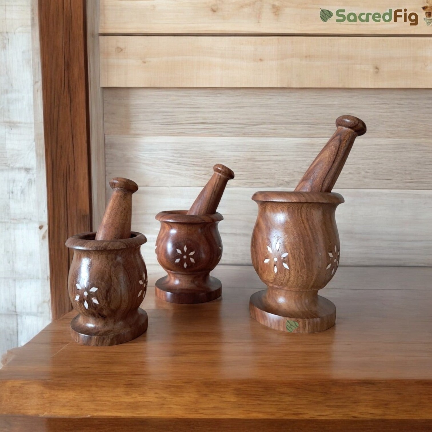 SacredFig Wooden Inlay Mortar set| Okhli Musal for Grinding Spices, Masala Grinder| S,M,L Sizes