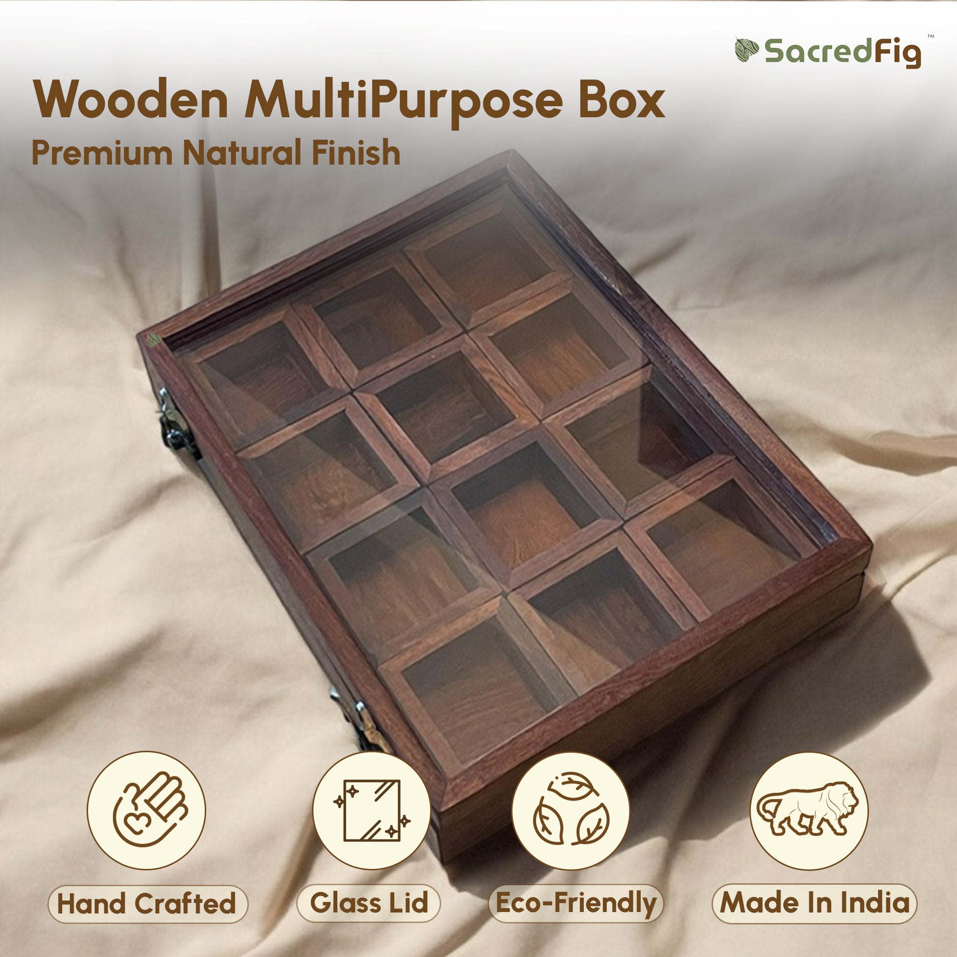 This handcrafted Sheesham wooden box is a versatile and elegant addition to your home. With 12 removable compartments and a glass lid design, it can be used as a jewelry storage box, spice and masala organizer, dry fruit and snack box, tea and coffee storage, or trinket and accessory holder. The durable and long-lasting natural Sheesham wood finish adds a rustic touch to any space. Keep your items organized and easily accessible with this multipurpose wooden box.