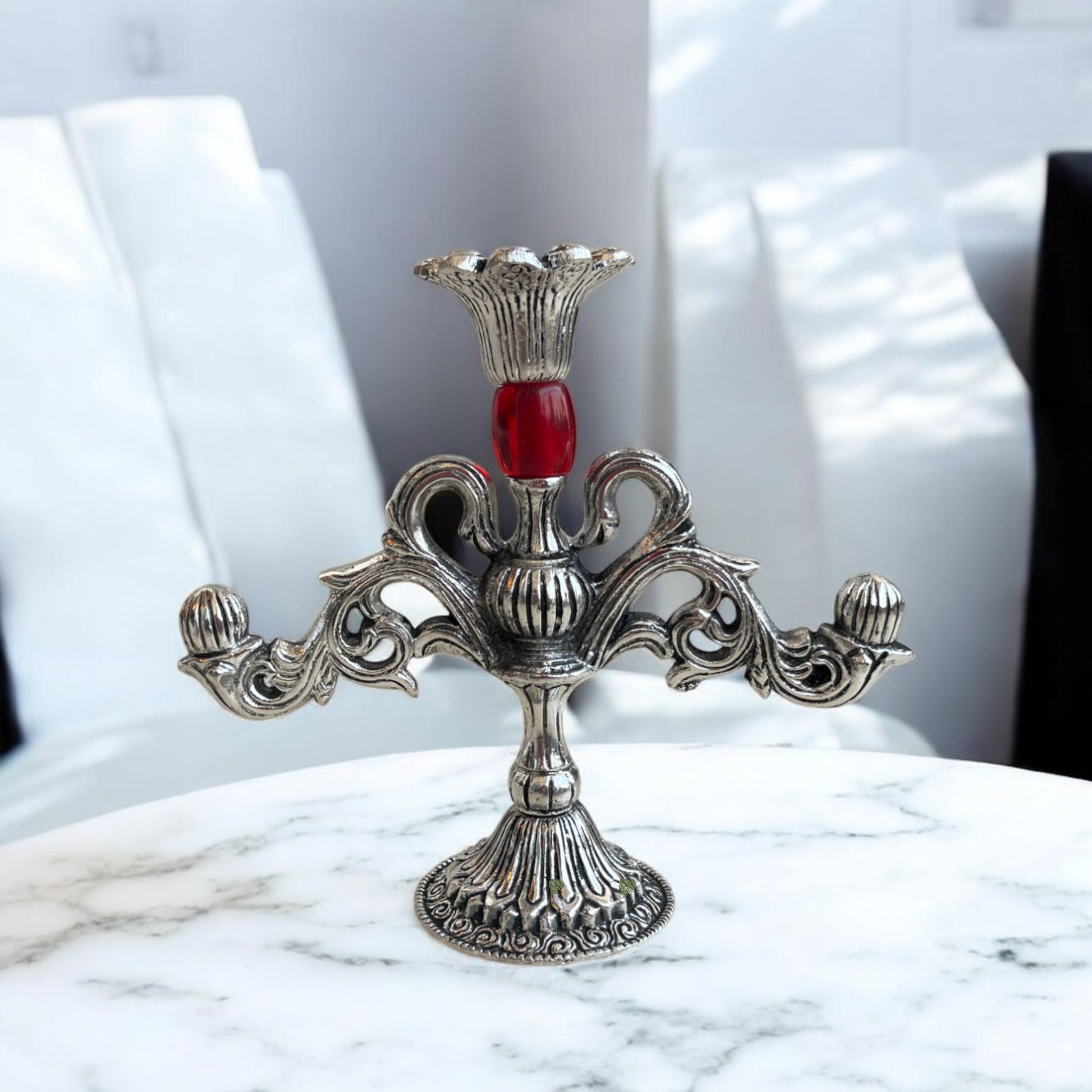 Add a touch of elegance to your home with our Silver Candle Holder with Elegant Red Accent. This royal and ornate candle stand is handcrafted to perfection, making it a timeless and artistic addition to any room. Make a statement with this luxurious and unique decor piece, perfect for any occasion.