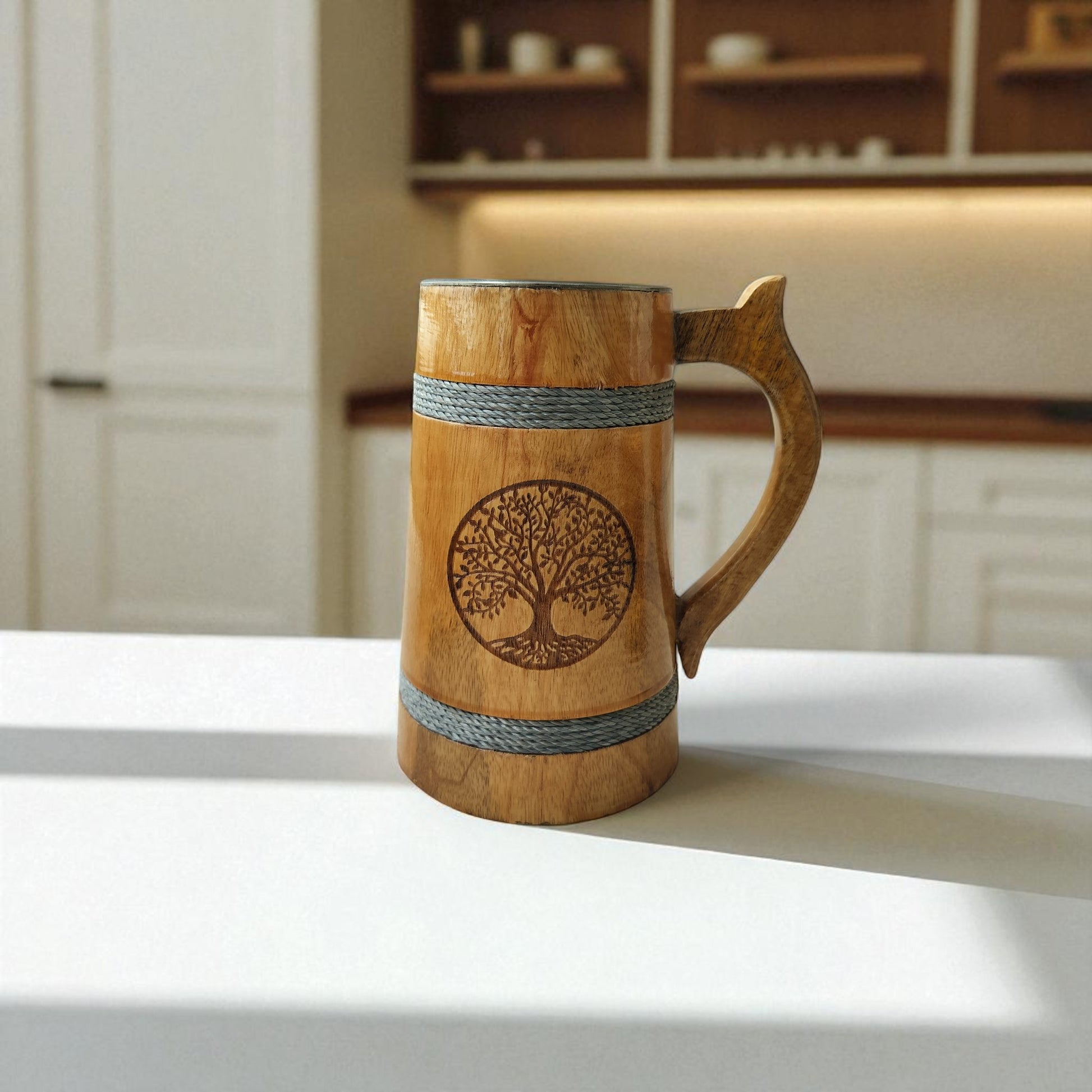 SacredFig Wooden Mug Large with Steel Lining – 500ml | Silver Rings & Tree Engraving | Handcrafted Large Rustic Mug
