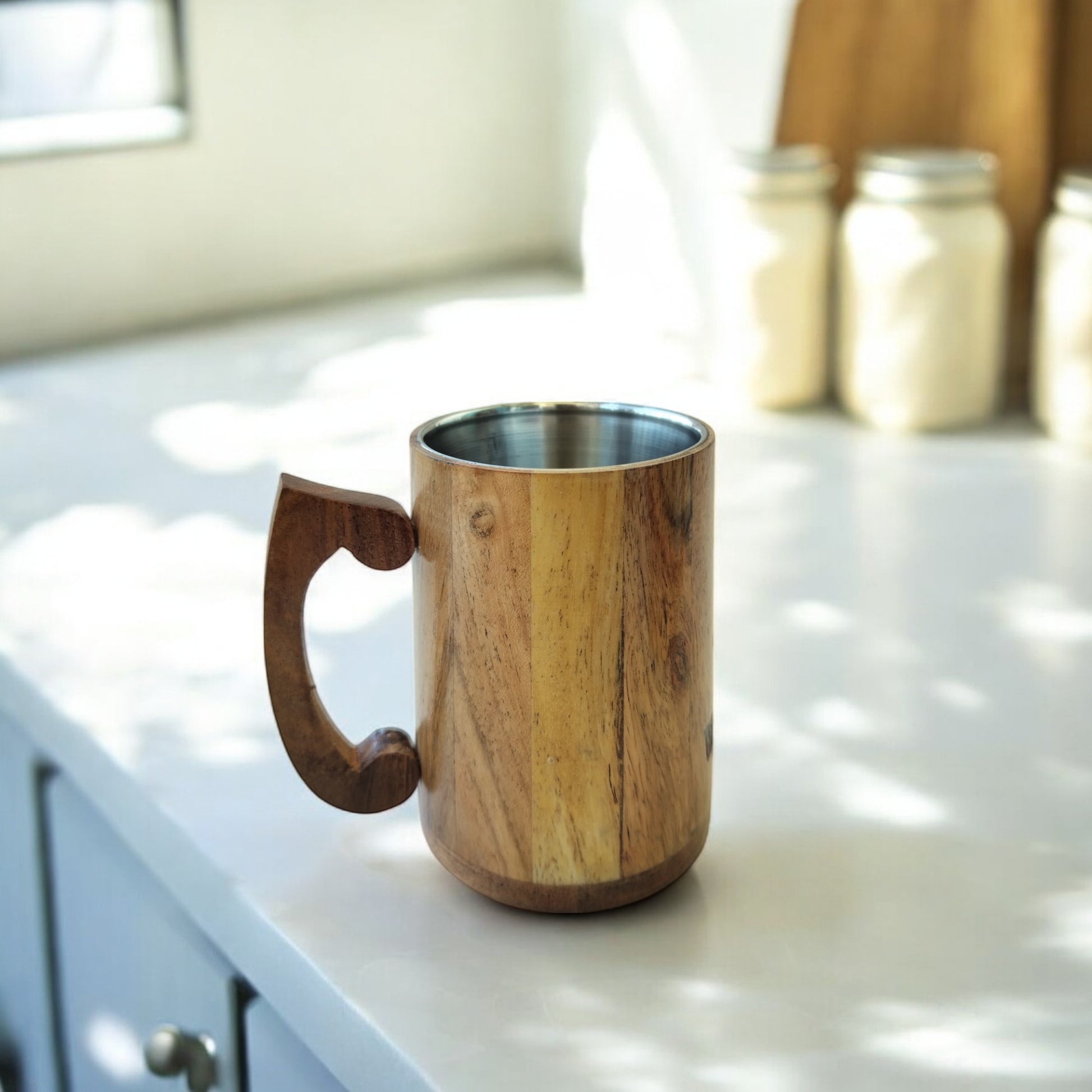 Enjoy your favorite beverages with this expertly crafted wooden mug, featuring a 300 ml capacity and dimensions of 11.5 cm height by 7 cm diameter. Constructed from premium wood and lined with stainless steel, it ensures optimal temperature retention for both hot and cold drinks. Its natural wood finish adds a sophisticated, rustic appeal, making it ideal for daily use or as a distinguished gift. Perfect for tea, coffee, or cold brews, this mug combines durability with timeless elegance.